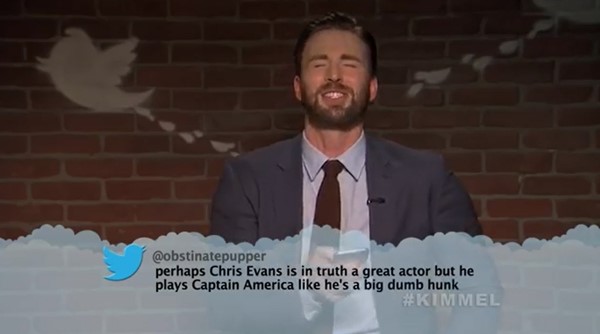 크리스 에반스는 “걔는 캡틴 아메라카 역을 맡을 땐 지가 싼 똥처럼 연기해”라는 악플을 읽고 크게 웃었다.