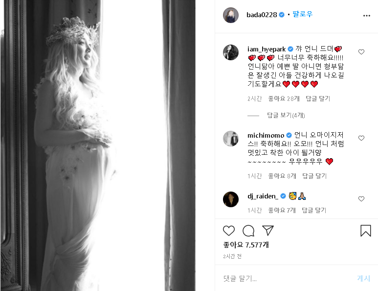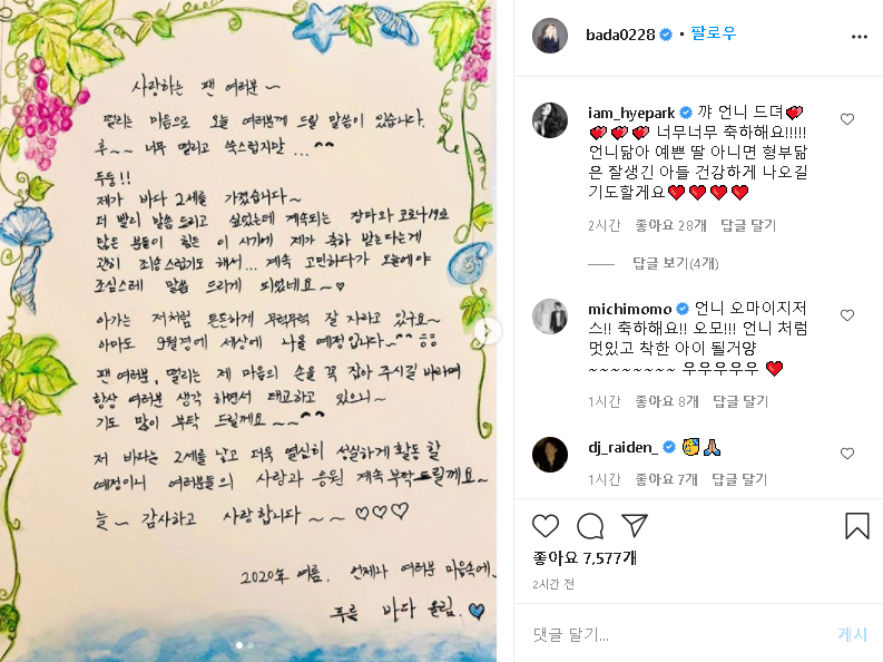 그는 “바다 2세를 가졌다. 더 빨리 말씀드리고 싶었늗네 계속되는 장마와 코로나19로 많은 분들이 힘든 이 시기에 축하받는다는 게 괜히 죄송스럽기도 했다. 계속 고민하다가 오늘에야 조심스레 말씀드리게 되었다. 아가는 나처럼 튼튼하게 무럭무럭 잘 자라고 있다. 아마도 9월 경에 세상에 나올 예정”이라고 덧붙였다.