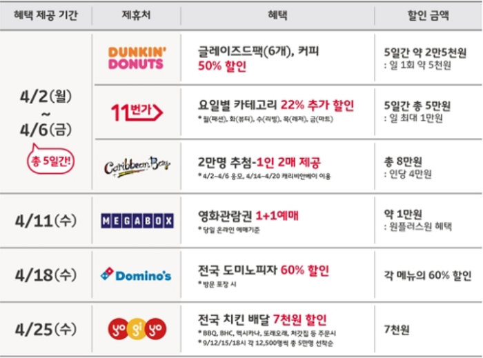 같은 달 수요일에는 11일 메가박스 영화관람권 1+1 예매, 18일 도미노피자 60% 할인(방문 포장시), 25일 요기요 전국 치킨배달 7천원 할인 등의 혜택이 있다.