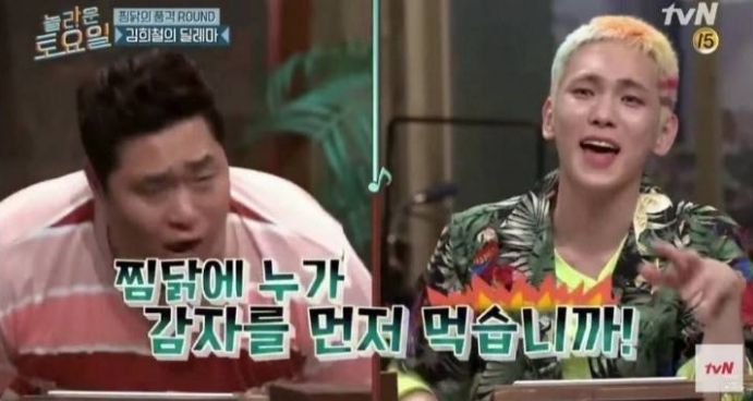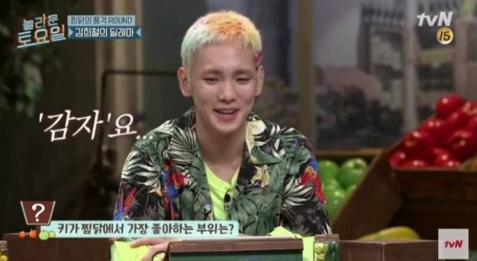 키는 “감자요…”라고 답했고 문세윤은 화들짝 놀라며 “병원부터 보내라니까, 쟤 아픈 거라고!”, “찜닭에 누가 감자를 먼저 먹습니까!”라고 외쳐 키와 찜닭에 대해 토론을 이어갔다.