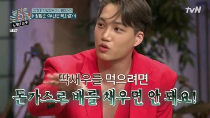 최근 엑소 찬열, 백현, 카이가 출연한 편에서 음식에 대해 이야기하며 카이는 “딱새우를 먹으려면 돈가스로 배를 채우면 안돼요!”라고 말했다.