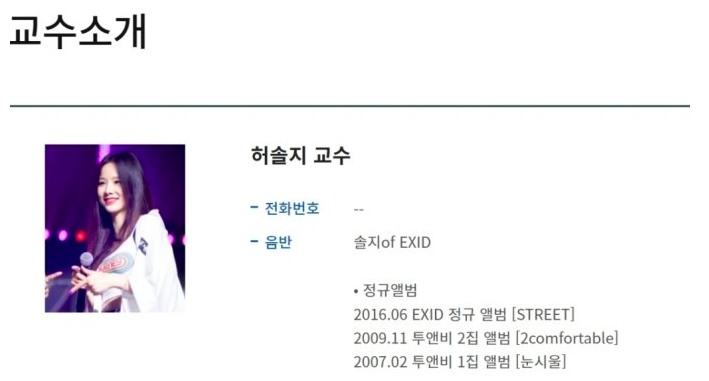 최근 용인예술과학대 실용음악보컬과는 홈페이지 교수 소개란에 솔지의 사진과 약력이 게시됐다.
