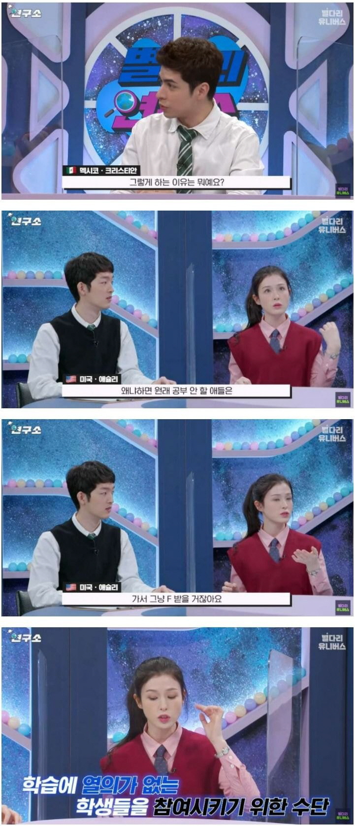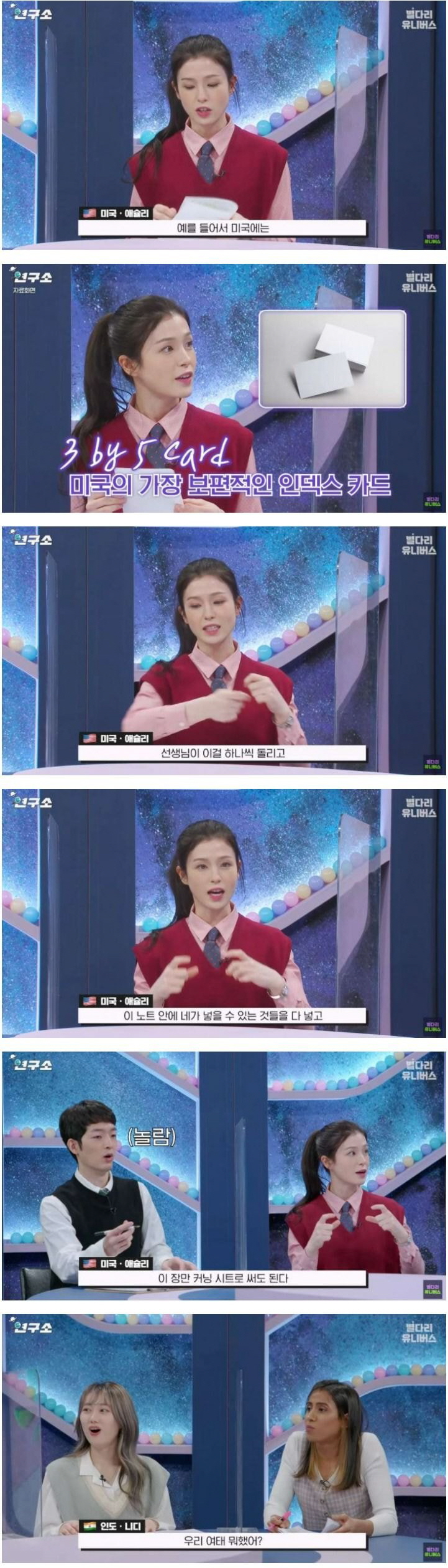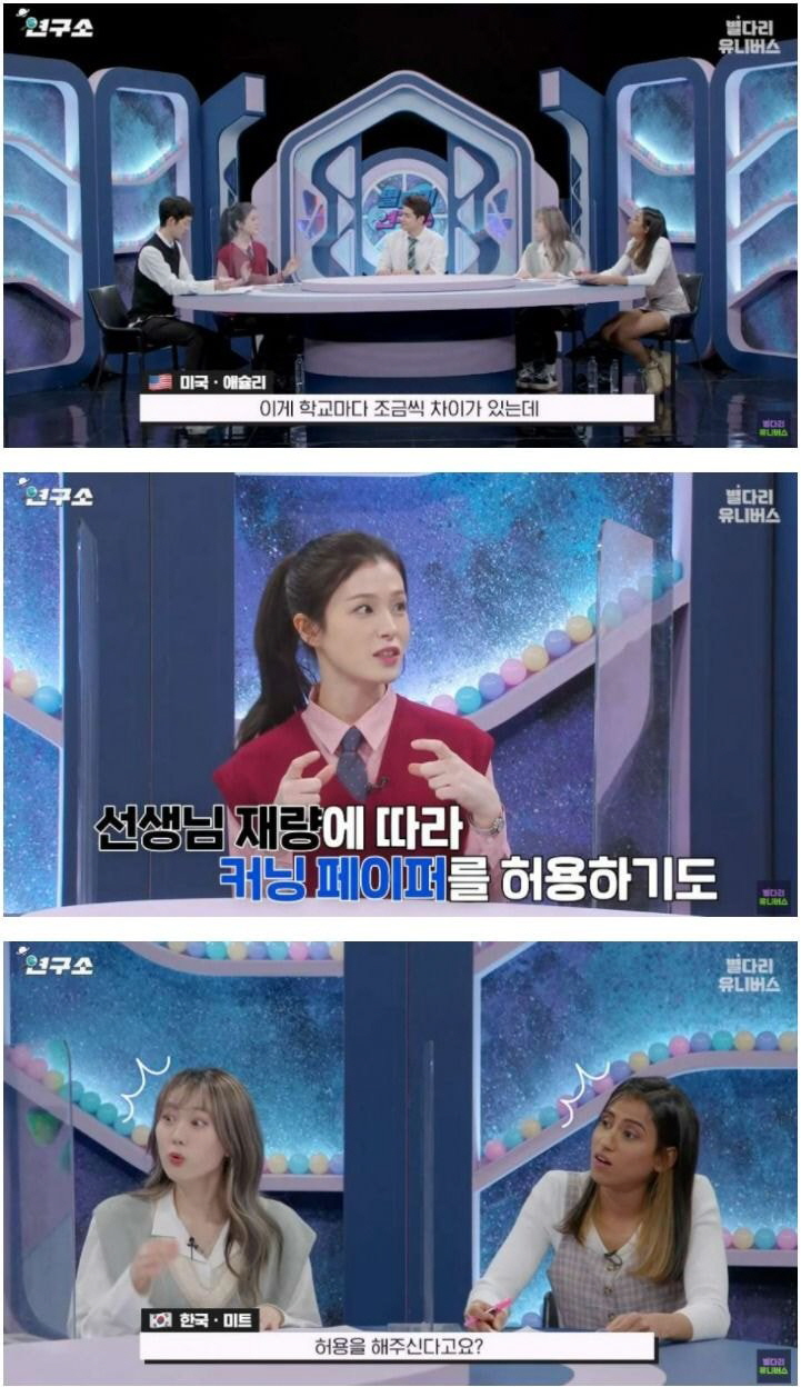 방송에 출연한 미국인 출연진은 “미국에서는 선생님의 재량에 따라 커닝 페이퍼를 허용하기도 하는데 인덱스카드를 하나씩 돌리고 커닝 시트로 만들라고 합니다.”라며 이야기를 시작했다.