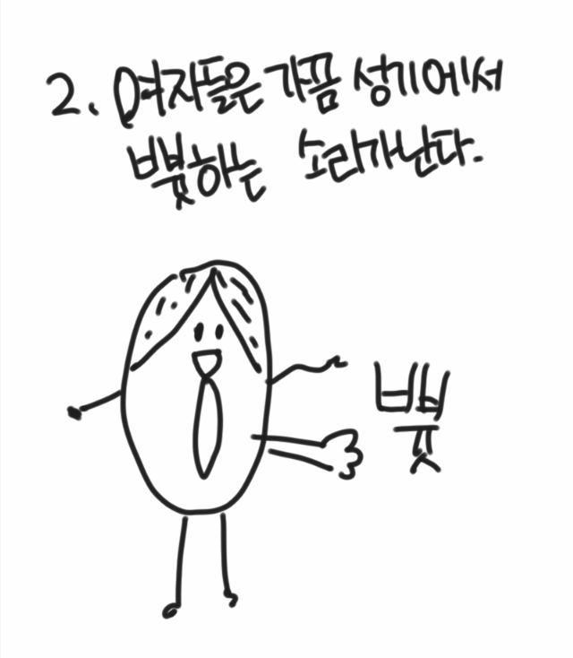 | 마찬가지로 여자의 성기는 구멍이 있으니 그 구멍에 공기가 차면 방귀가 나올 수 있습니다. | +) 오해할까봐 덧붙이자면 자궁이나 질 속에서 공기가 생성 되는 게 아니라 밖에 있는 공기가 들어오고 나가는 중 소리가 나는 겁니다.