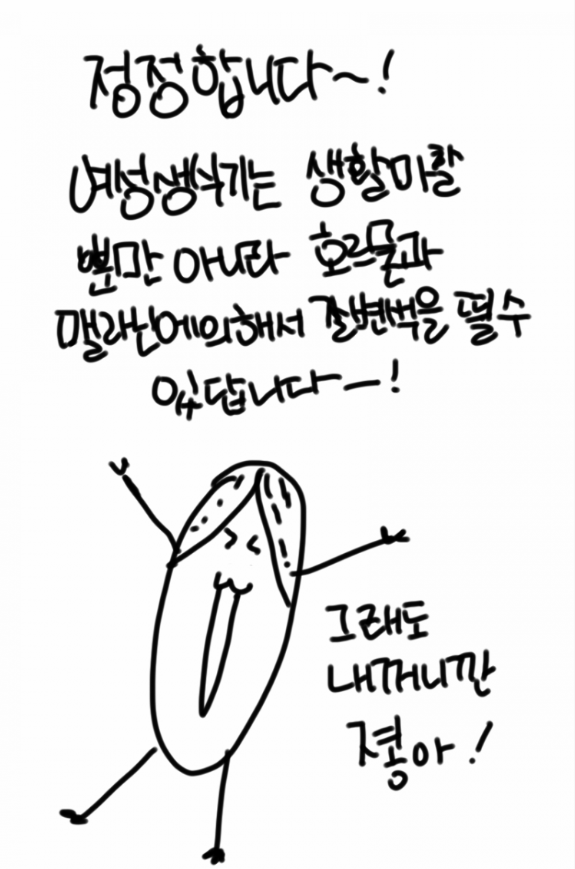 3) 여자의 성리는 개인다다. 천차만별! 영국에 있을 때 알게 된 탈북자언니는 생리를 하루 한대요. 그만큼 영양이 결핍 ..되어있단 거겠죠… 김정일 김정은 새끼… 저도 이 안 좋았을 땐 2일 정도 뭐 이상한 날에는 2주 정도 합니다. 쉴새없이 피 뿜뿜……. 중학교 때 친구는 2,3개월에 한번씩 2주씩 생리하고 6개월에 한 번만 하시는 분도 있고…….(좋은 게 아니라고 들었습니다.)