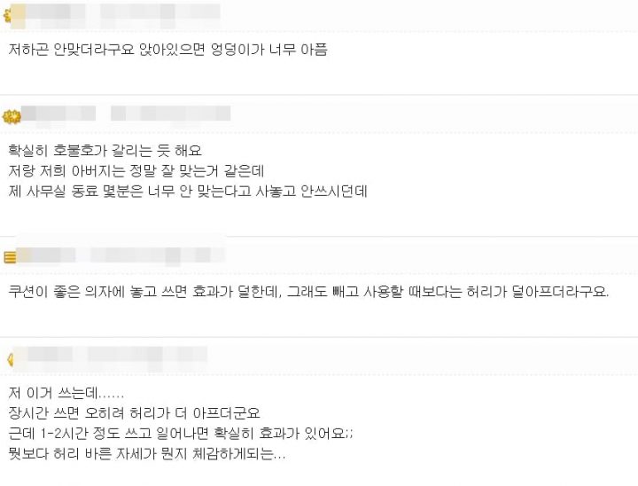 반면 효과를 본 소비자들도 있었다. “사무실에 갖다놨는데 처음에는 불편했지만 지금은 하루종일 사용함. 지금은 오히려 사용 안하면 허리 아픔”, “나는 효과 봤는데”, “처음에는 불편하지만 시간 지나면 없으면 못산다”등의 반응을 보였다.
