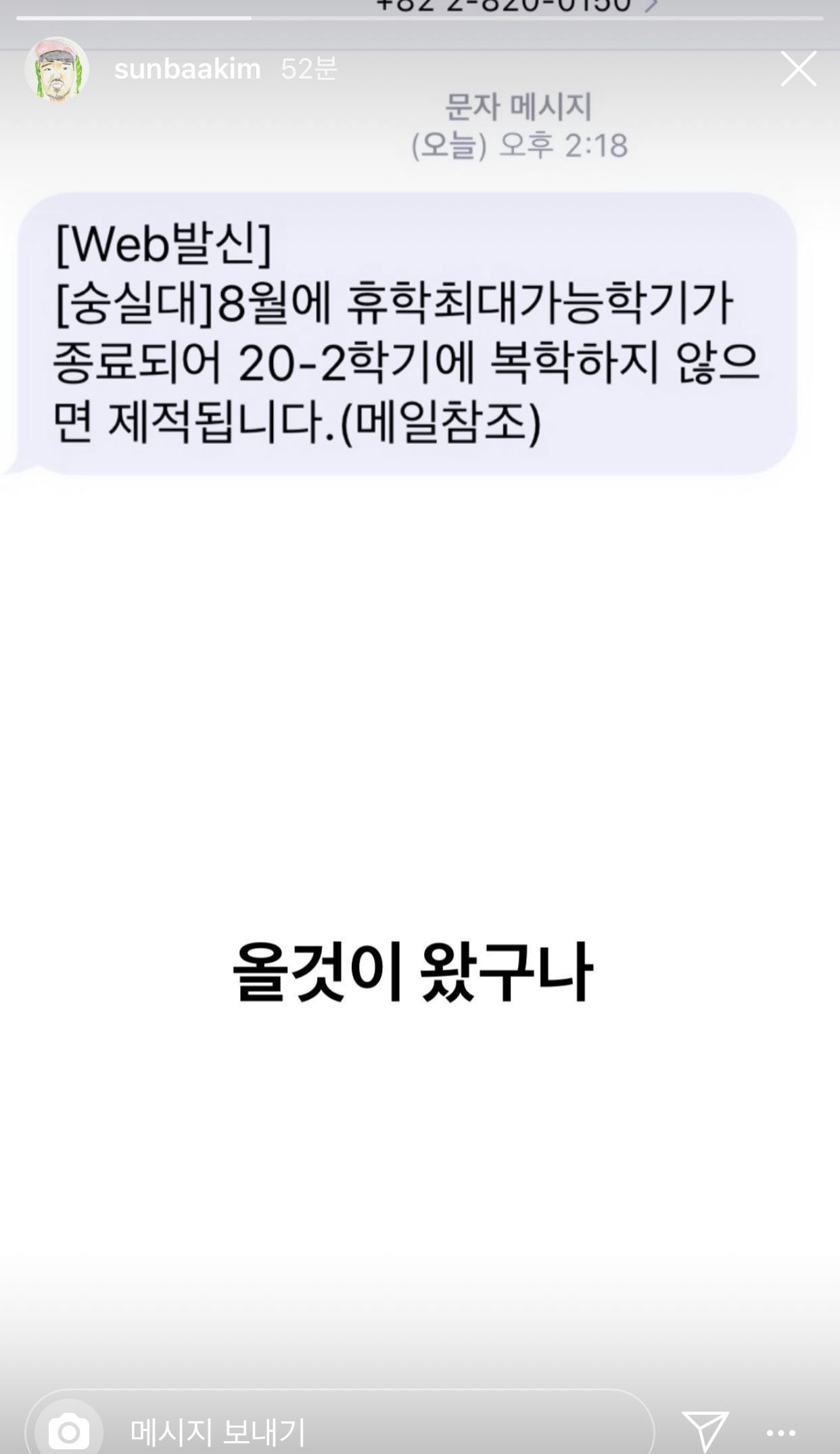 이 메시지는 숭실대학교 철학과 10학번으로 휴학중이던 선바의 휴학 기간이 만료됨을 알리는 것이었다.