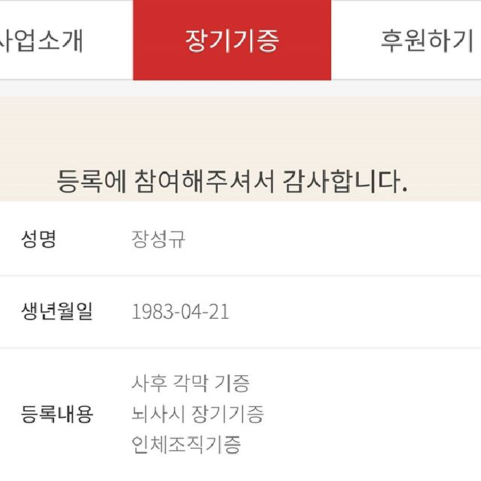 그의 장기기증 서약 인증 사진에는 사후 각막 기증, 뇌사시 장기기증, 인체조직기증 등의 내용이 담겨 있다.