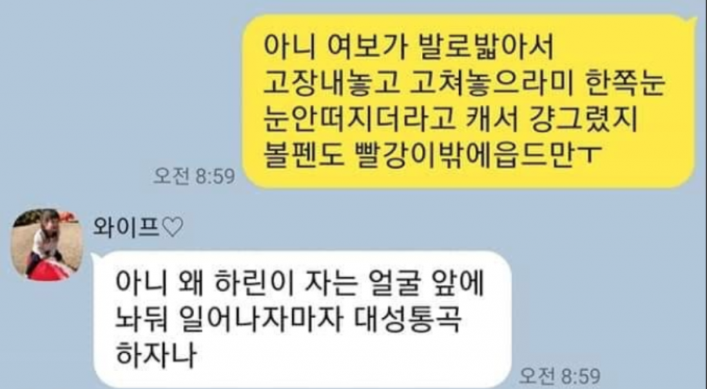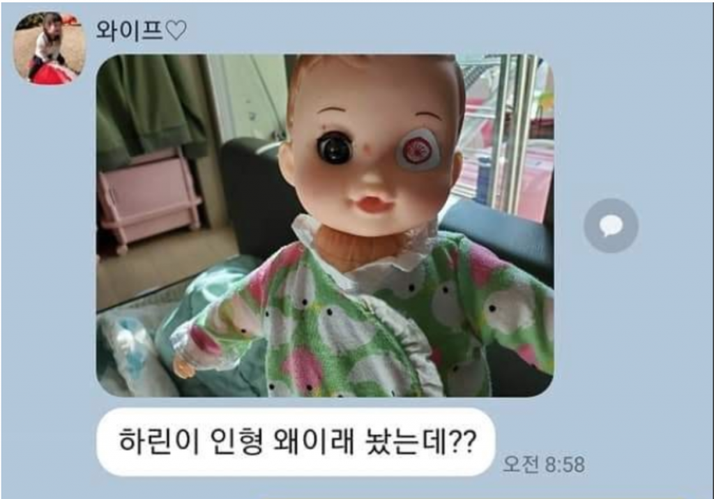 게시글을 올린 남편의 부인은 채팅 어플로 “하린이 인형 왜이래 놨는데??”라며 문자를 보냈다.
