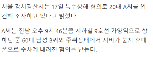 지하철에서 휴대전화로 60대 남성의 머리를 수차례 내려친 혐의를 받고 있는 20대 여성 A씨가 검찰에 송치됐다는 소식이 전해졌다.