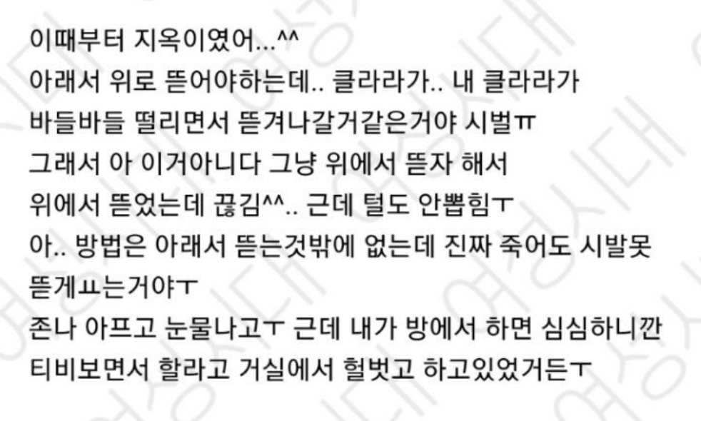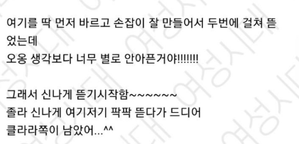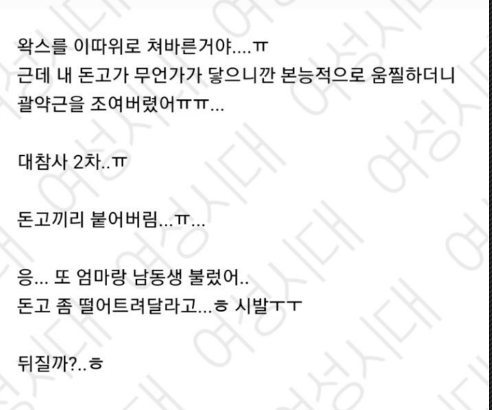 확 잡아뜯는순간에 나도모르게 빠지직 소리를 내며 설사를 지림 ㅠㅠ