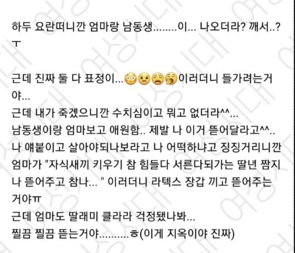 “아 미치겟어 ㅈㄴ 냄새나 ” 이런 말과 “점심 뭐먹을래 ?…..야 된장찌개 시키지마 나 죽겟어 ” 이런말들….방향제 뿌리는 소리 등등 너무너무 자존심이 상했습니다…..