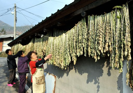 작성자가 글과 함께 올린 사진을 보면 삶은 시래기가 아파트 계단 난간을 끝없이 줄이어 걸려 있다.