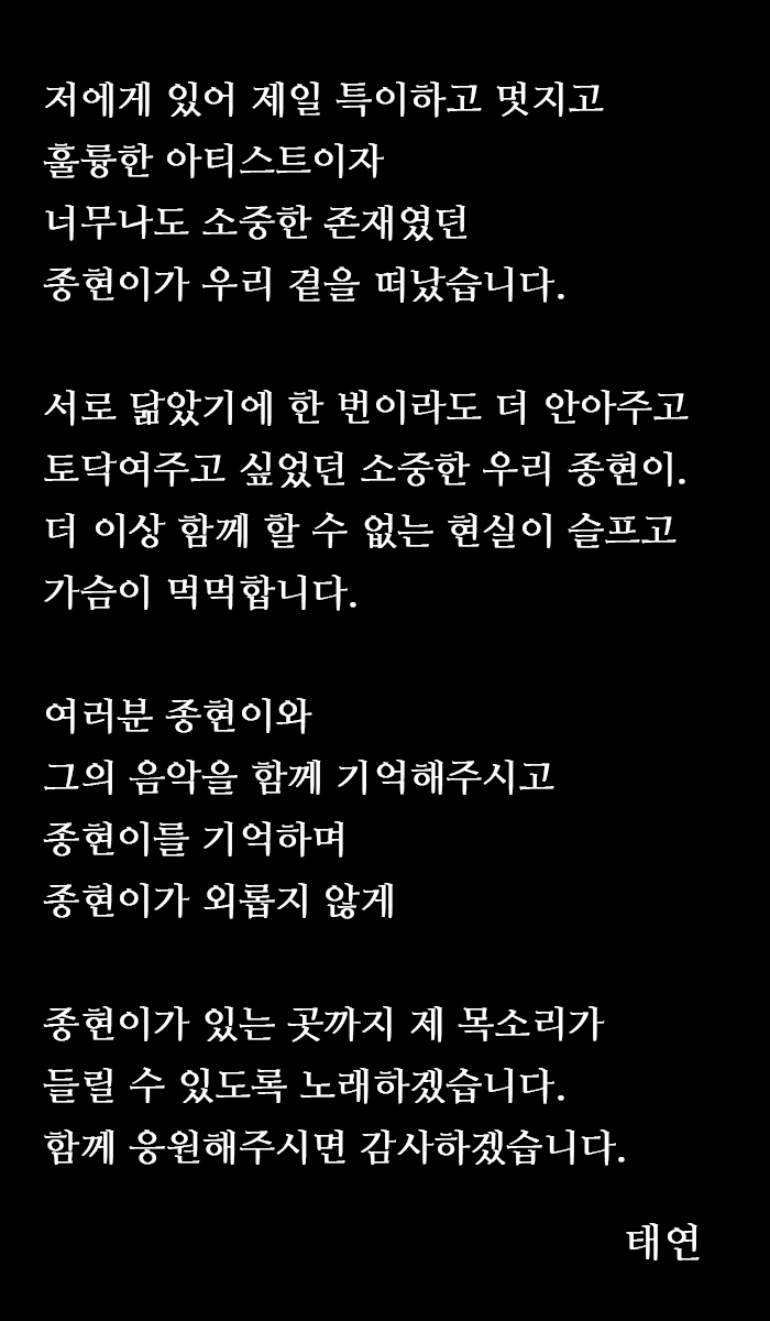 태연은 “종현은 나에게 있어 너무나 소중한 친구였고, 훌륭한 아티스트였다. 그런 그가 우리 곁을 떠났다”며 “종현과 나는 서로 닮은 점이 많았고, 그래서 더 안아주고 토닥여주고 싶었다. 그런데 이제 더 이상 종현이 세상에 없다는 현실이 슬프고 가슴이 먹먹하다”고 말했다.