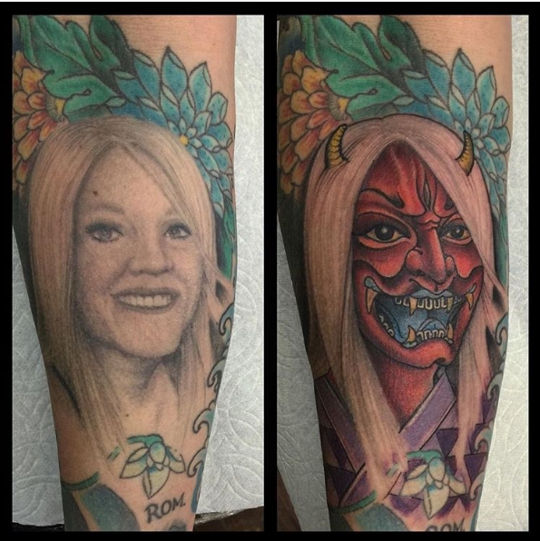 타투커버업에는 먼저 밑그림을 그려구도를 잡은뒤 더 진한 색채의 염료로 문신을 덧씌우는 작업이 이어진다.
