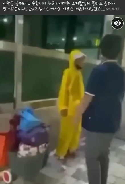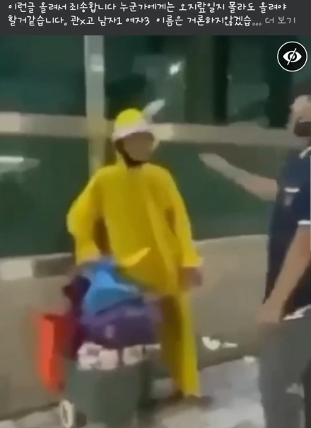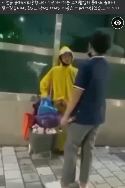 영상속 노란 우비를 입은 60대 여성 노인과 교복을 착용한 고등학생이 쪼그려 앉아서 무슨 이야기를 나누고 있다.