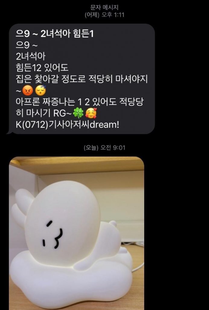 “이 녀석아 힘든 일이 있어도 집은 찾아갈 정도로 적당히 마셔야지”, “앞으론 짜증 나는 일이 있어도 적당히 마시기”, “기사 아저씨 드림”, “혼내려는 건 아니고 아끼기 때문에 잔소리를 한 건데 오해를 한 것 같네”, “기분 상했다면 사과할게”, “행복한 하루 되렴”
