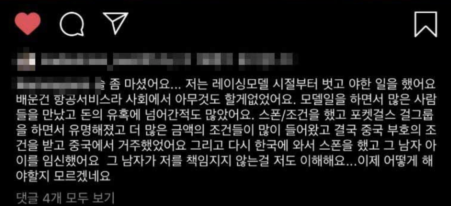 한 걸그룹의 멤버였던 그녀는 자신의 인스타그램에 자신이 ‘스폰’과 ‘조건’을 했다고 고백했다.