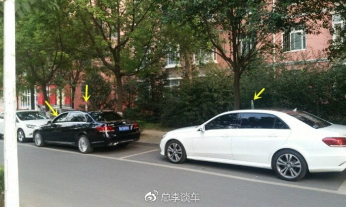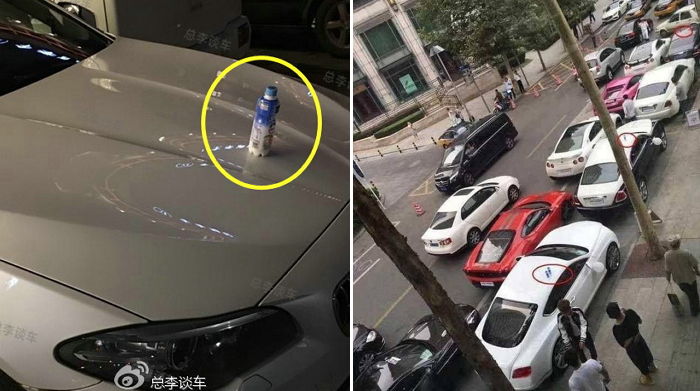 중국의 대학교 정문에서 주차된 고급차량들 위에 정체불명의 ‘페트병’들이 올려져 있는 것을 볼 수 있다.