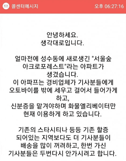 생각대로는 “아크로포레스트는 경비업체가 기사분들에게 오토바이를 밖에 세우고 걸어서 들어가게 하고, 신분증을 맡겨야 하며 엘리베이터만 이용하게 하고 있다”고 부당한 현실을 고발했다.