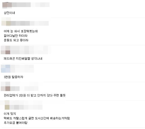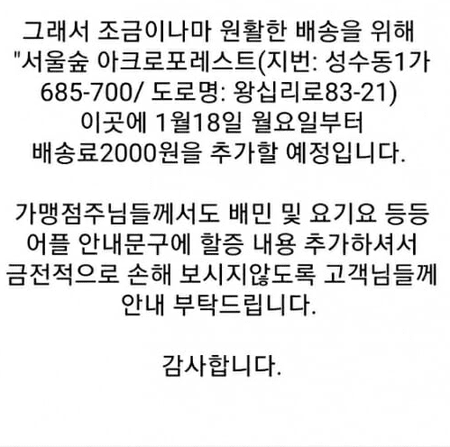 특히 “기존 할증 지역보다도 기사분들이 배송을 더 많이 꺼려하고, 한 번 가신 기사분들은 두 번 다시 안가시려고 한다”면서 “조금이나마 원활한 배송을 위해 ‘서울 숲 아크로포레스트’에 배송료 2천원을 추가한다”고 전했다.