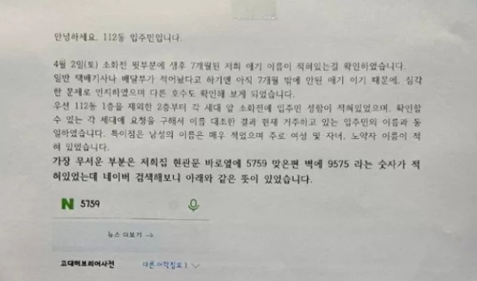 또 현관문 바로 옆에 5759라는 숫자가 있어 검색해 본 결과 고대 히브리어로 어린아이, 유아, 젖먹이를 뜻한다며 해석하기 어려운 뜻으로 집에 아기가 있다는 것을 적어 뒀다는 생각에 A씨는 충격에 빠졌다.