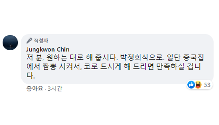 또한 그는 댓글을 통해 “저 분, 원하는 대로 해 줍시다. 박정희식으로. 일단 중국집에서 짬뽕 시켜서, 코로 드시게 해 드리면 만족하실 겁니다”고 말했다.