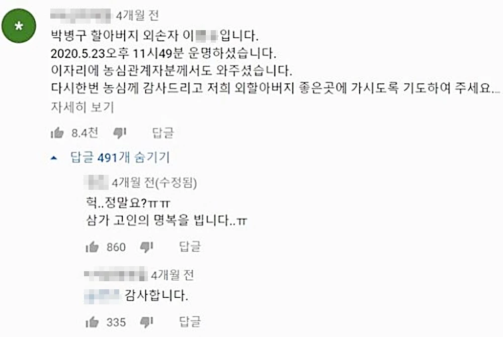 해당 댓글 속에는 박 할아버지에 대한 안타까운 소식이 담겨져 있었는데 고령임에도 불구하고 건강을 유지했던 박 할아버지는 안타깝게 지난해 5월에 세상을 떠났다.