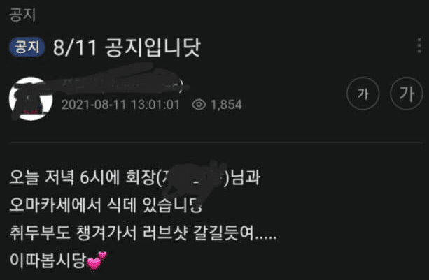 이 여자bj는 아프리카TV 공지 게시판에 “오늘 저녁 6시에 회장님(열혈팬)과 오마카세 식사데이트 있습니다. 취두부도 챙겨가서 러브샷 갈길듯요. 이따봅시다”라 글을 작성했다.