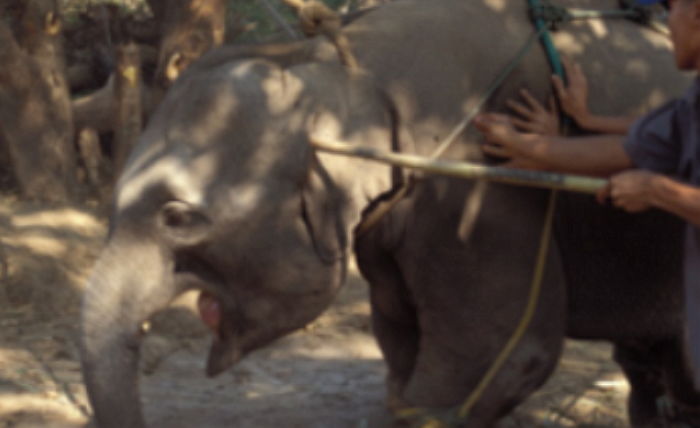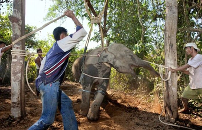 사육사는 코끼리가 순종적이지 않을 때마다 날카로운 쇠갈고리로 머리를 때리거나 움직일 수 없는 좁은 우리 안에 가둬 밤낮을 보내게 한 뒤 훈련을 견디게 한다.