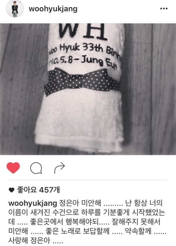 과거 장우혁은 자신의 인스타그램에 수건을 선물한 팬에 대한 글을 게시하기도 했다.