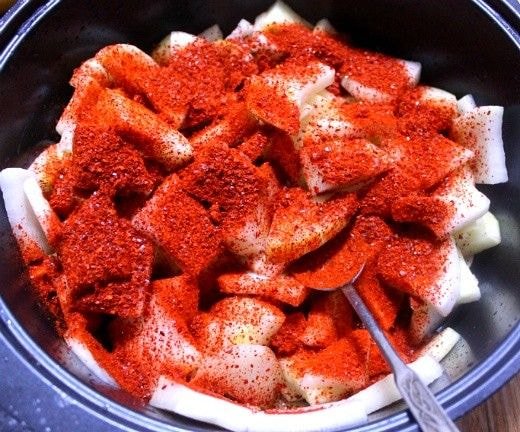 #7. 고춧가루 7큰술을 넣고 고추가루 물을 입혀준다.