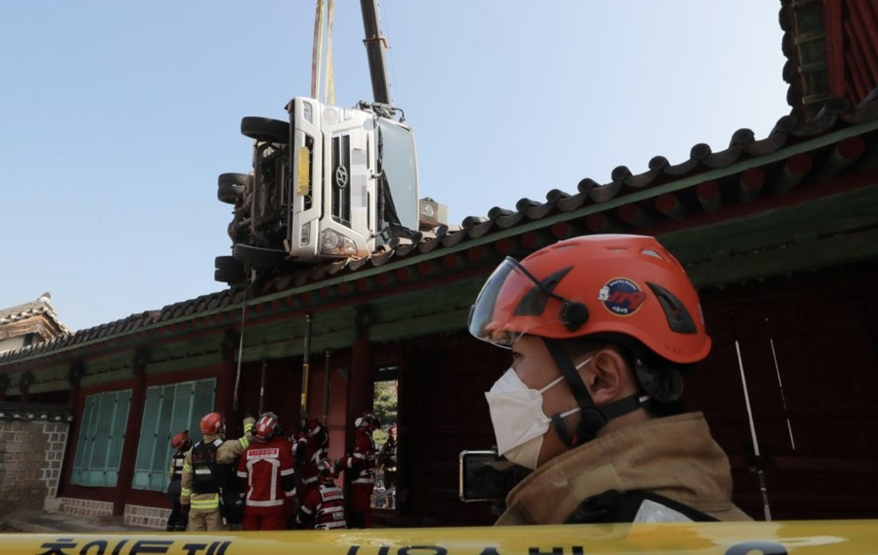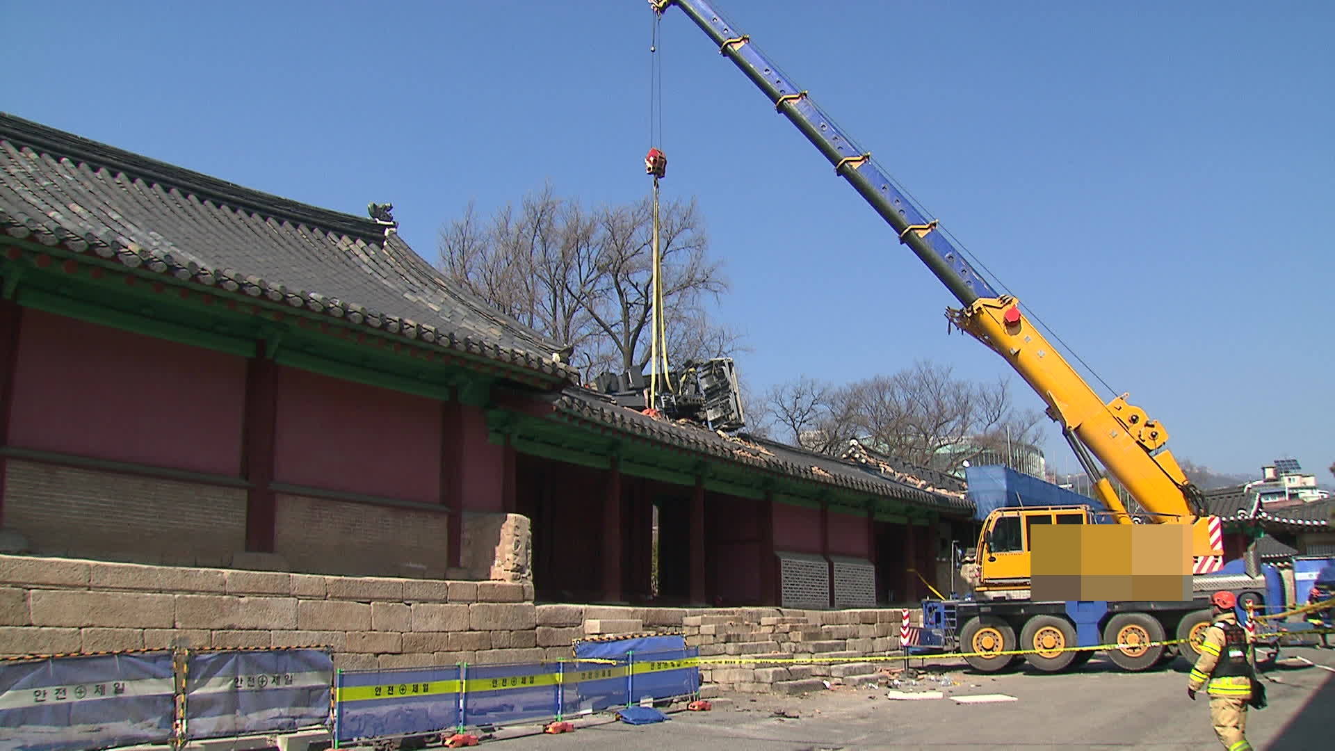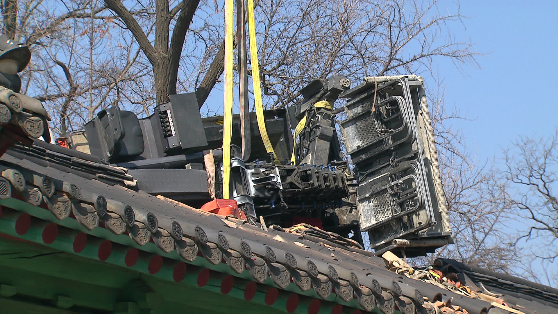 우리나라 보물로 선정되어 있는 ‘문묘’ 지붕 위에 떨어진 사다리차.