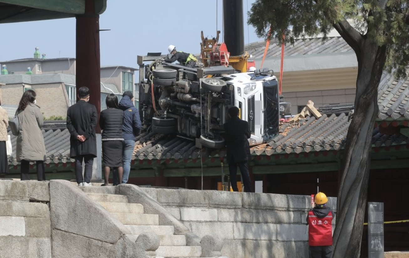 보물 제141호인 성균관 ‘문묘’의 동삼문에 사다리차가 떨어져 지붕 일부가 파손되는 사고가 벌어져 화제다.