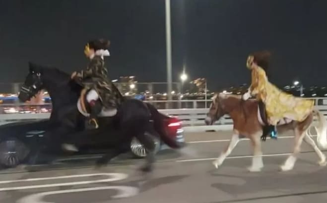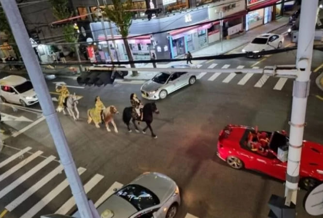 해당 사진 속 기마부대는 실제 살아있는 말을 타고 도로 위를 달리고 있었다.