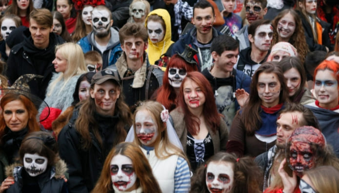 사진 속 기마부대 사람들은 할로윈을 기념하기 위해 전통 의상과 마스크와 가면을 착용한 것으로 보인다.