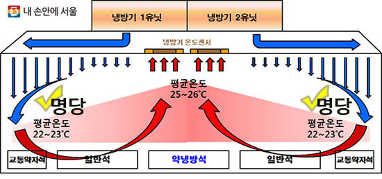 서울교통공사에 따르면 지하철 내 온도는 냉방기를 가동했을 때 좌석 위치에 따라 2~4도씩 온도 차이가 난다고 한다.