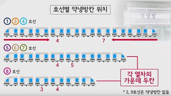 지하철 내에서 가장 시원한 곳은 바로 ‘객실 양쪽 끝 교통약자 배려석 주변’인데, 이 곳은 공기의 흐름이 없고 천장에 설치된 냉방기로부터 유입되는 냉기만 남아있어 지하철 내에서 가장 시원하다고 한다.