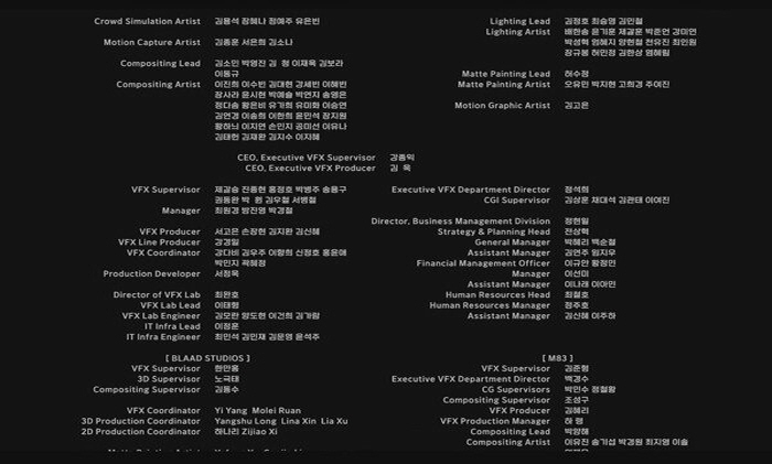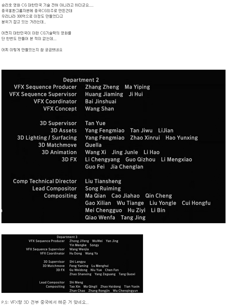이 네티즌은 영화 크레딧에 나온 스태프 롤에 중국 회사 팀원들 이름을 언급하며 “VFX랑 3D 전부 중국에서 해준 것”이라며 주장했다.