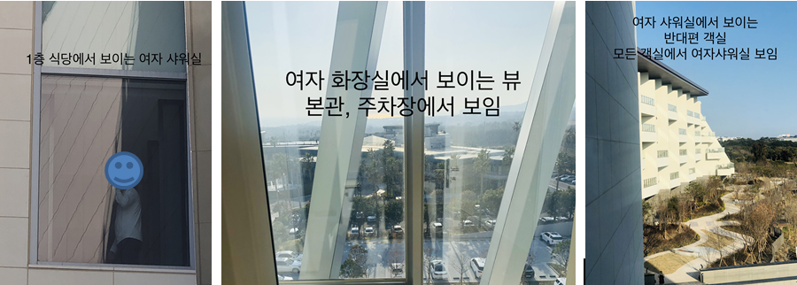 호텔 직원 동행 하에 확인한 결과 호텔 입구, 산책로, 주차장, 심지어 객실 발코니 어느 각도에서도 샤워실과 화장실 내부가 선명하게 보였습니다.