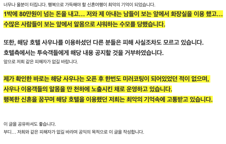 제주 5성급 호텔 사우나에서 알몸 노출된 신혼부부의 호소.