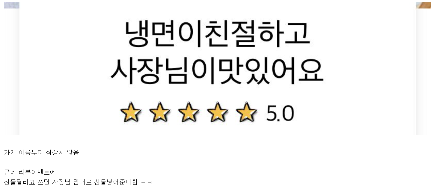글쓴이는 “가게 이름부터 ‘냉면이 친절하고 사장님이 맛있어요’이며 굉장히 독특한 음식점입니다.”라며 이야기를 시작했다.
