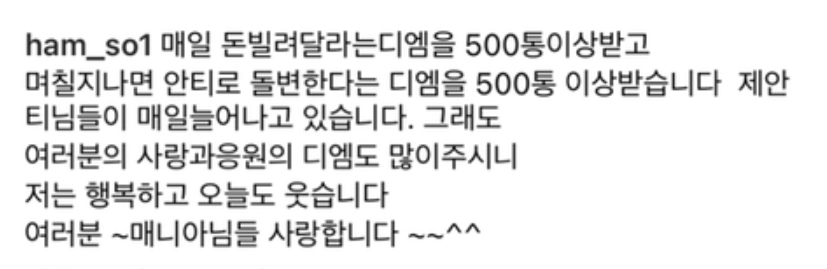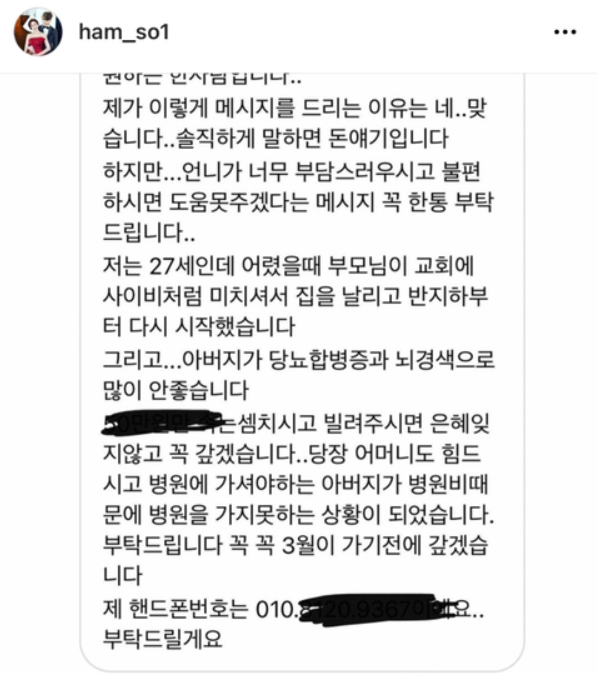 해당 게시물에는 함소원이 받은 디엠 내용이 담겨져 있다.
