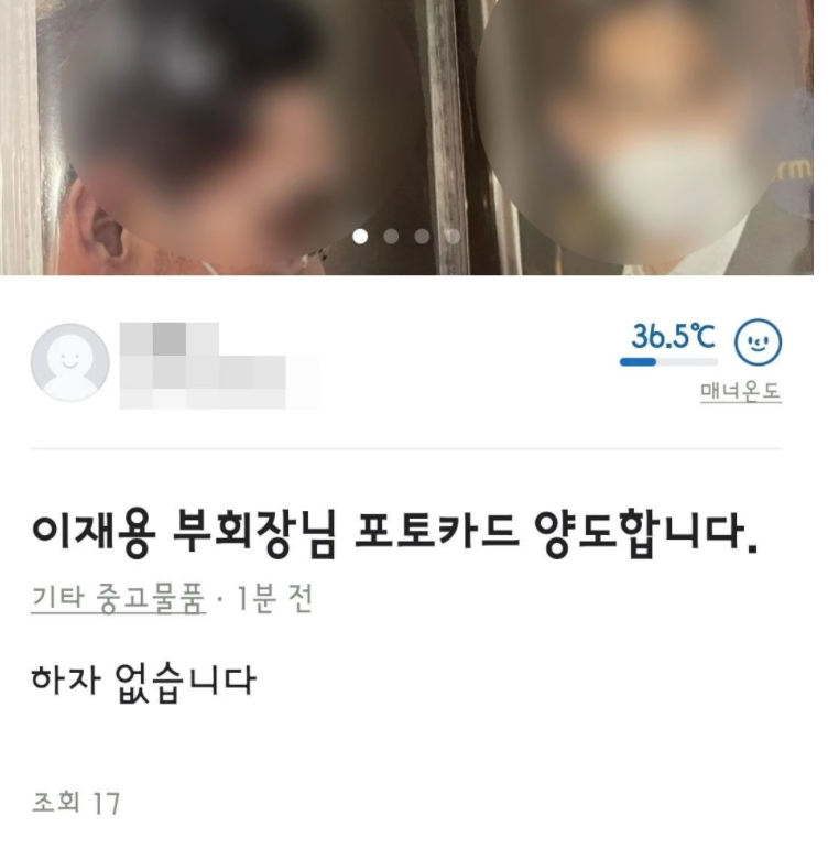 이재용 삼성전자 부회장의 포토 카드가 중고거래 사이트인 당근마켓에 올라와 화제이다.