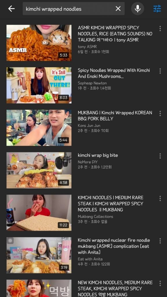 실제 유튜브에는 ‘kimch wrap spicy noodles’라는 제목의 여러 콘텐츠들이 게시되어 있었다.
