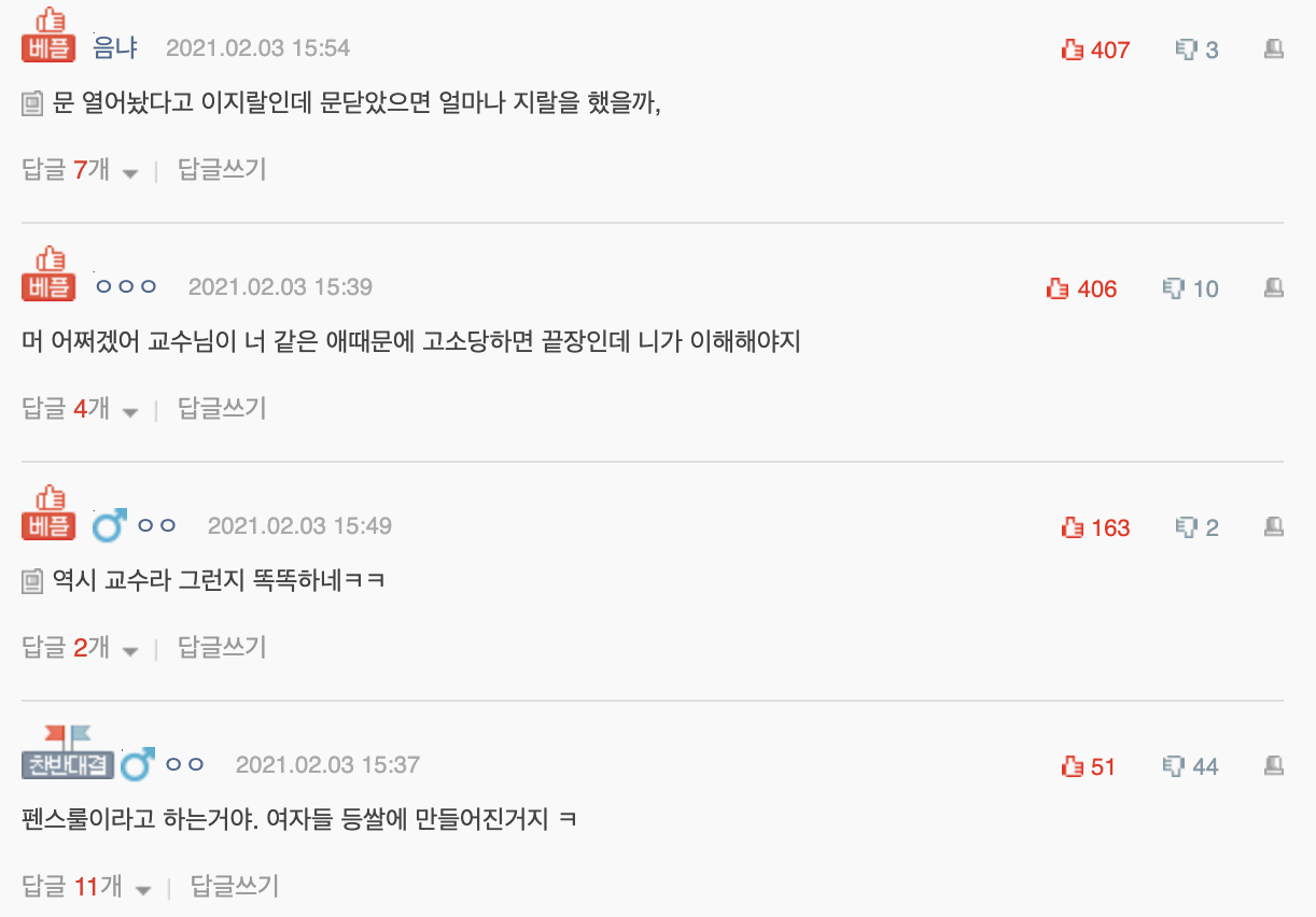 하지만 교수님은 웃으시며 “자기도 그러고 싶은데 요즘 분위기도 그렇고 얼마전에 우리 학교에 문제가 생겨서 어쩔 수 없다”며 “여학생 뿐만 아닌 남학생들도 와도 똑같이 하니 양해해달라”고 했다고 한다.
