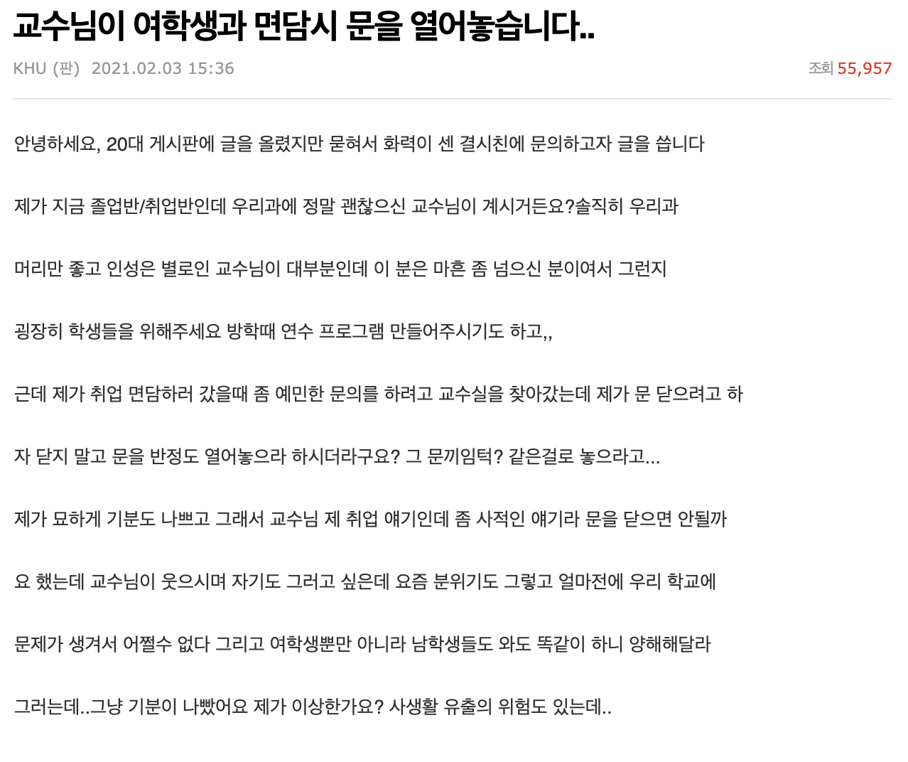 최근 한 온라인 커뮤니티에 ‘교수님이 여학생과 면담시 문을 열어놓습니다’라는 제목의 게시물이 게재되어 많은 네티즌들의 관심을 모으고 있다.