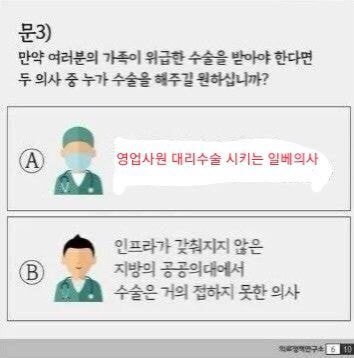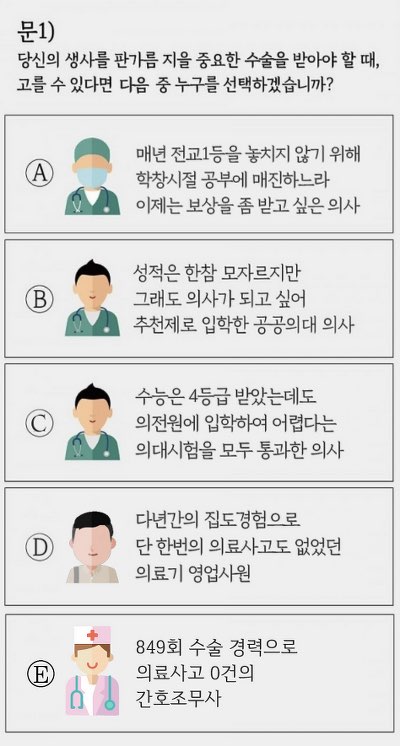 첫 번째 질문은 ‘당신의 생사를 판가름 지을 중요한 진단을 받아야 할 때 의사를 고른다면 둘 중 누구를 선택하겠냐’ 였다.
