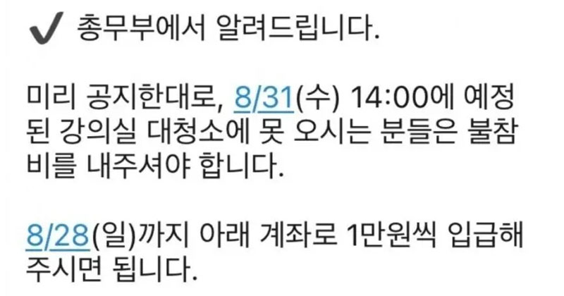 8/28(일)까지 아래 계좌로 1만원씩 입금해주시면 됩니다.”