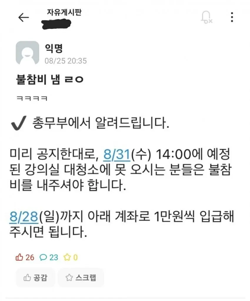 해당 게시글을 올린 작성자 A씨는 “지방대 의문의 불참비 대참사”라는 제목의 글로 많은 이들의 관심을 끌었다.